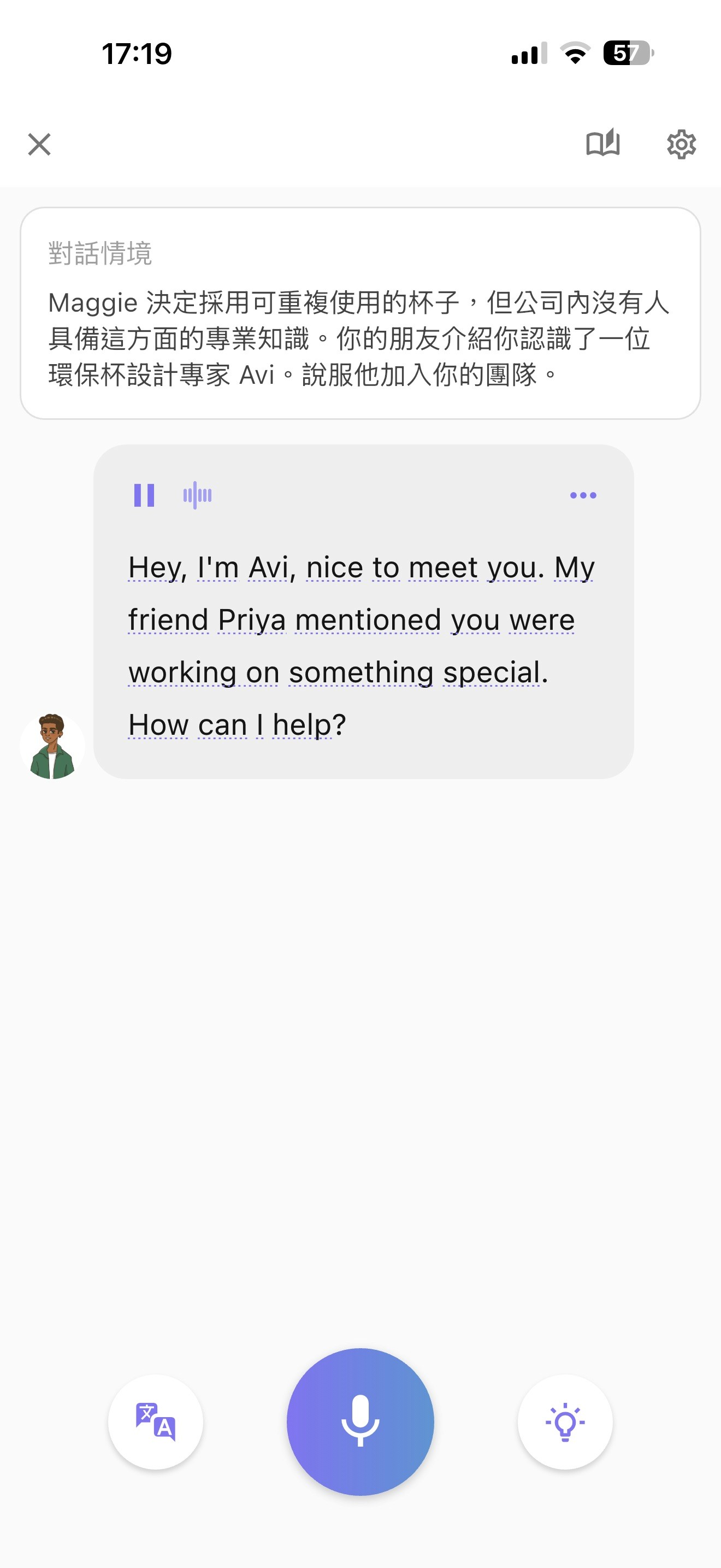 導師/角色 | 註冊可選 AI 導師角色(國籍、外貌、個性) | 雖無導師個性選項,但可與 AI 家教 或 AI 朋友聊天,並能在「自創情境」裡設定特定角色,達到類似體驗 |