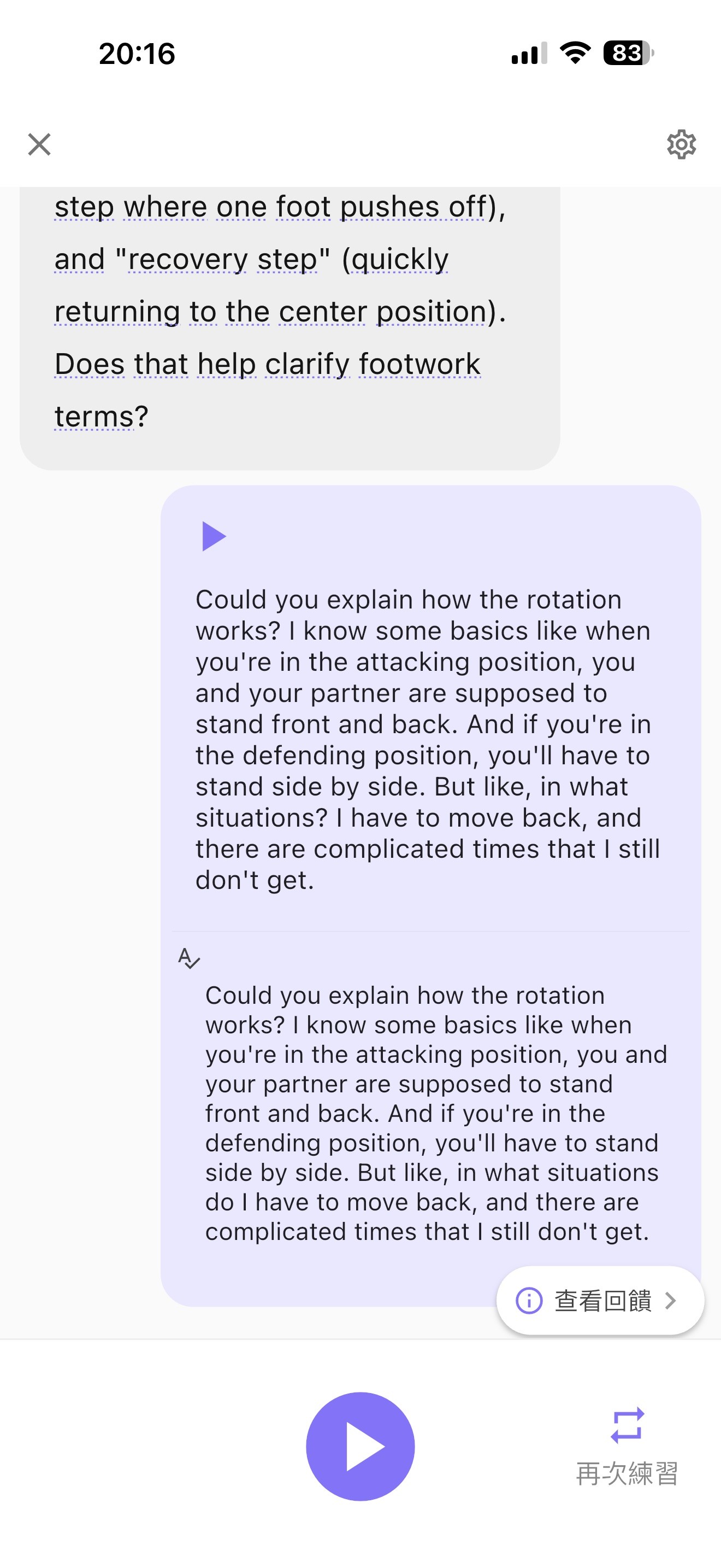 相較之下,Toko 在 AI 對話方面具明顯優勢:除了能進行自然、真實的情境對話外,還提供 四種提示回答功能,幫助你在卡住時找到合適的回覆方向;而且對話完還支援 重播完整對話,讓理解更直覺。同時,Toko 也會針對你的回覆提供 即時的文法與用法回饋,幫助你更快掌握正確表達與自然口說。