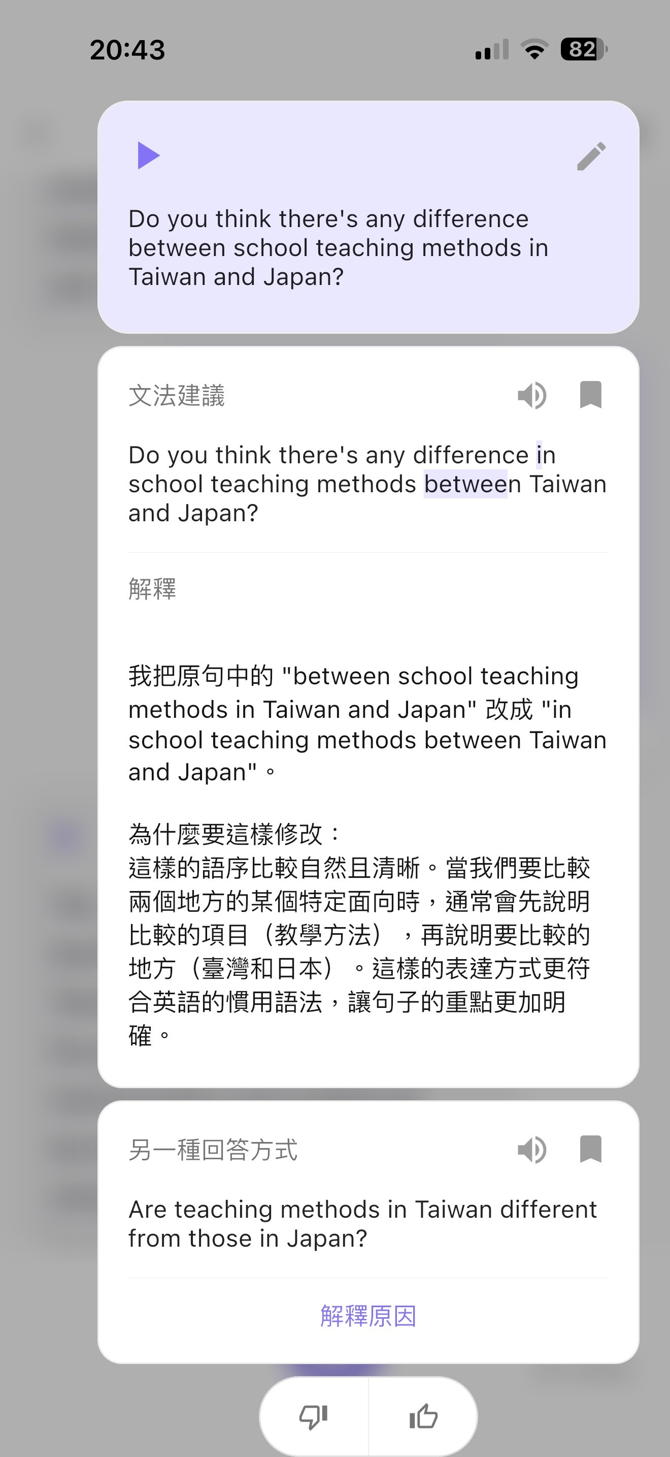 回饋方式 | 題目正確率、積分 | 文法糾正、替代表達 |