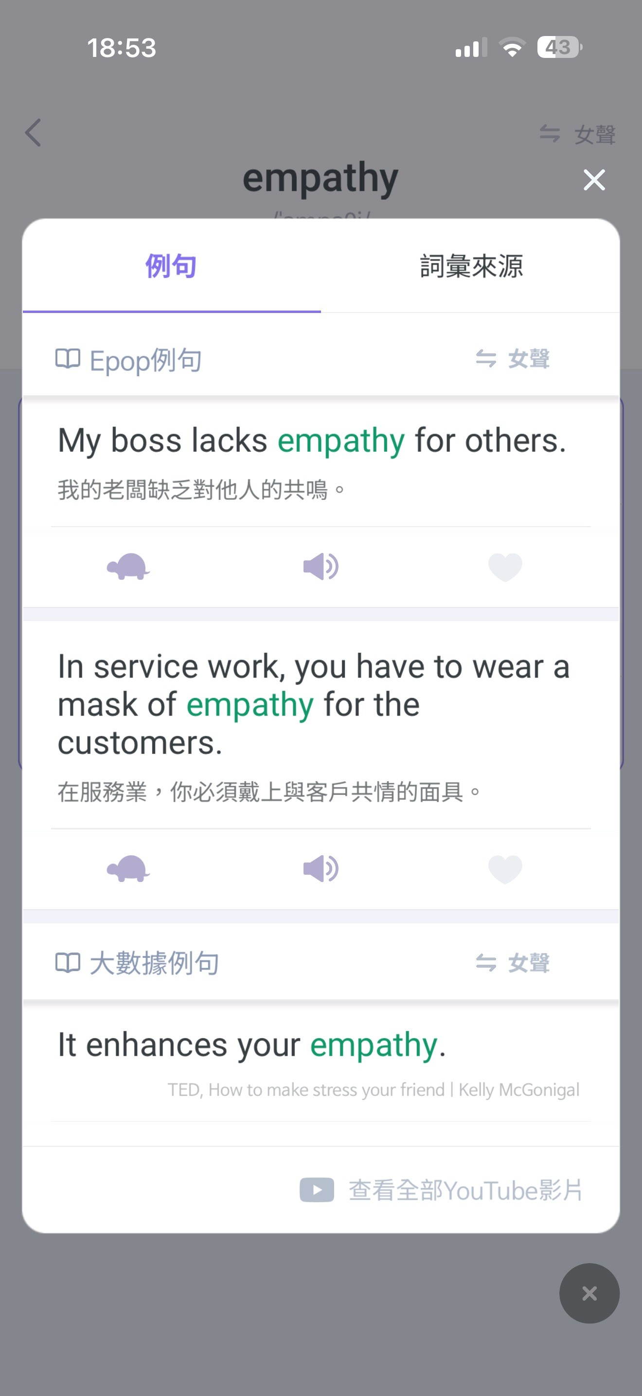 查字與影片例示 | 🏆 | ePOP 查字介面完整:3+ 例句、YouTube 範例、詞源與變化、發音檢測;Toko 查字介面較簡潔。 | |