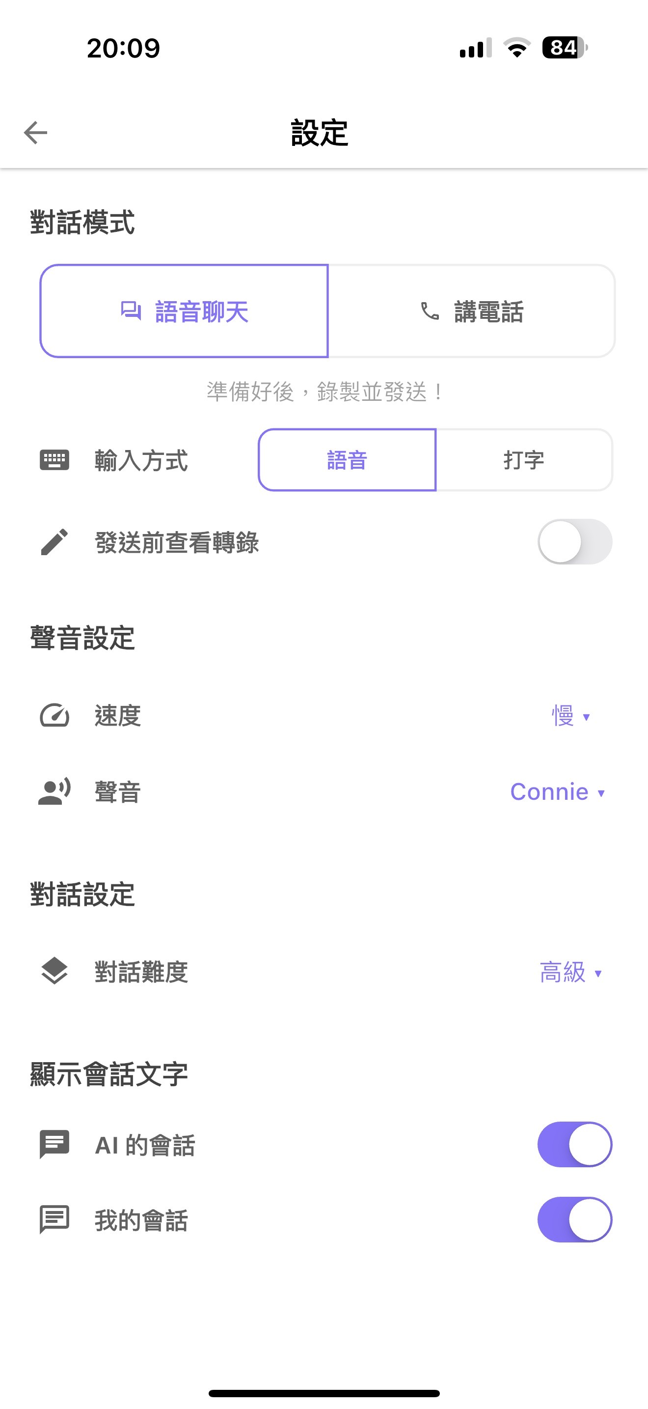 Toko 的體驗更接近真人家教。你可以調整四段語速、選擇十二種聲音(含男女聲),支援美、英、澳、印四種腔調,對話中會即時糾正文法與發音。